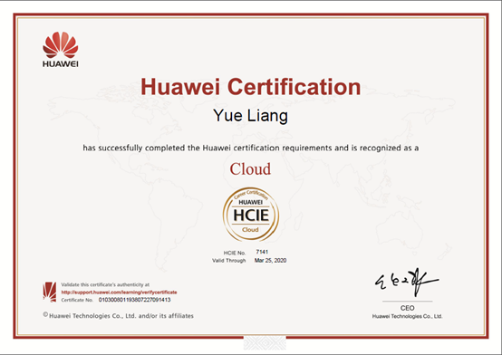 我校通信工程学院教师岳亮于2018年3月通过HCIE-Cloud(华为认证互联网专家-云计算)的全部考试环节,获得HCIE-Cloud专家级工程师证书,成为重庆高校第一位获得该专业方向IE认证的教师。