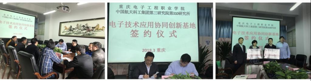 3月14日上午,重庆电子工程职业学院副校长刘成俊同中国航天科工集团第三研究院第三一〇研究所所长谷满仓在应用电子学院7215会议室为“电子技术应用协同创新基地”举行签约和揭牌仪式。