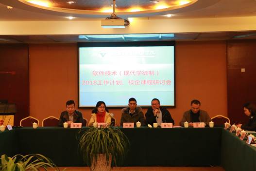 2018年1月12日、13日,软件学院举行了“软件技术(现代学徒制)2018年度工作计划报告与校企课程研讨会”。软件学院领导、教务处领导、11家合作企业代表、“现代学徒制”项目组成员、软件学院工作室负责人及教师代表等共计近40人参加了本次会议。