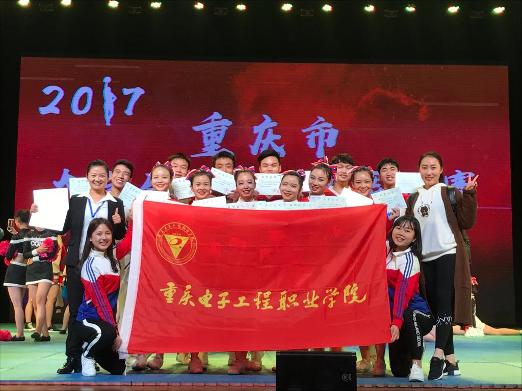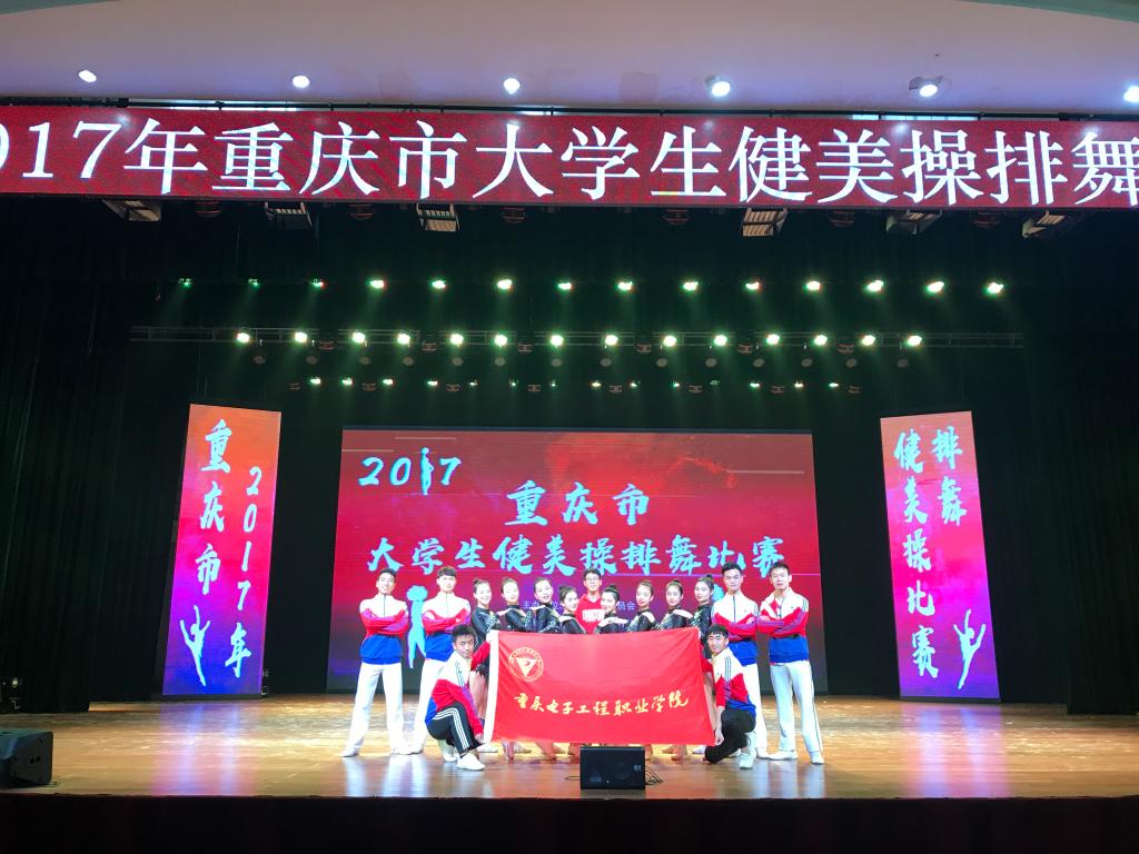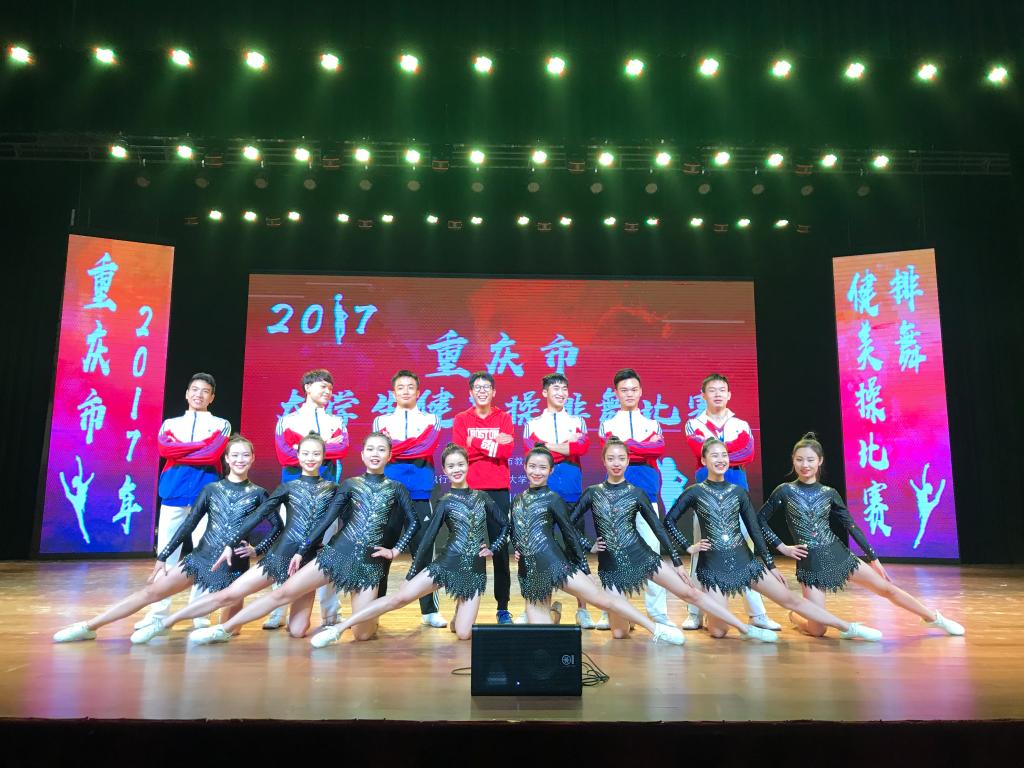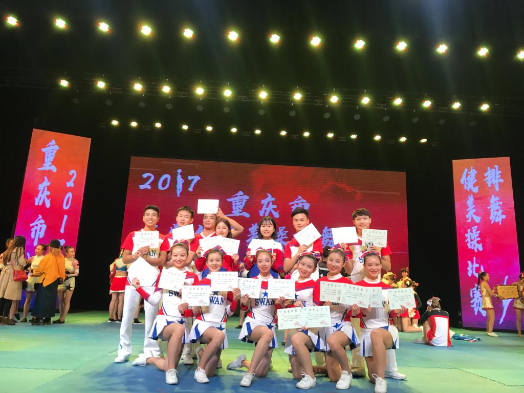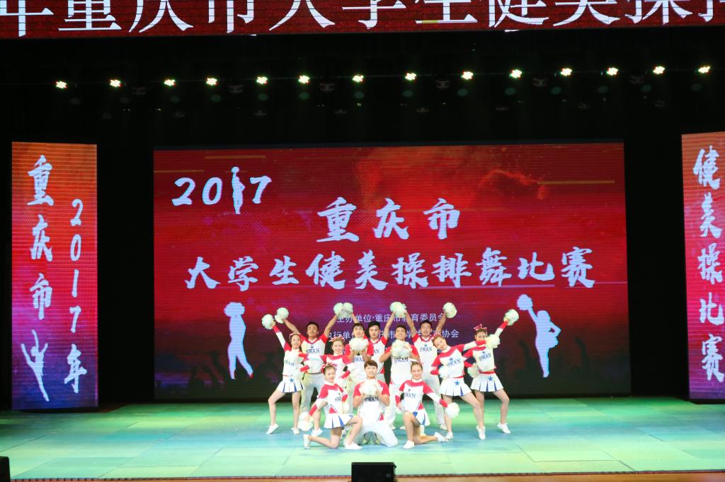 2017年11月8日至10日,由重庆市教育委员会主办,重庆市大学生体育协会、重庆市大学生健美操协会协办,四川外国语大学承办的2017年重庆市大学生健美操排舞比赛在四川外国语大学举行。我校啦啦操代表队队员们在比赛中努力拼搏,与各高校高手一决高下,展现出了优异的竞赛水平与体育精神,经过激烈角逐,最终获得2017年重庆市大学生健美操排舞比赛中获得大专院校组规定爵士舞蹈冠军,大专院校组自选花球舞蹈冠军。