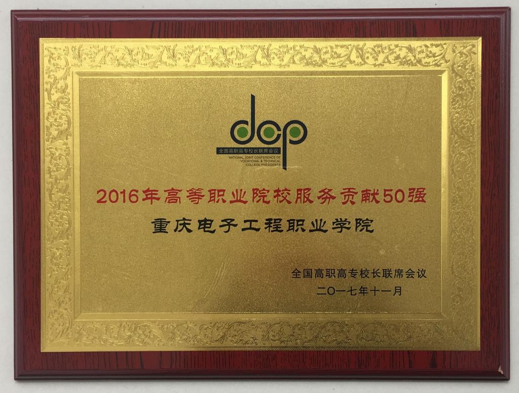 2017年年会表彰了2016年高等职业院校服务贡献50强和高等职业院校国际影响力50强,我校继2015年获得高等职业院校服务贡献50强后,再次荣获2016年高等职业院校服务贡献50强。2016年,全国高职高专联席会议开始评选2015服务贡献50强,我校作为重庆唯一院校入选。2017年,全国高职高专联席会议在评选服务贡献50强的基础上增加了评选高等职业院校国际影响力50强,重庆有2所学校入选高等职业院校服务贡献50强、1所学校入选高等职业院校国际影响力50强。