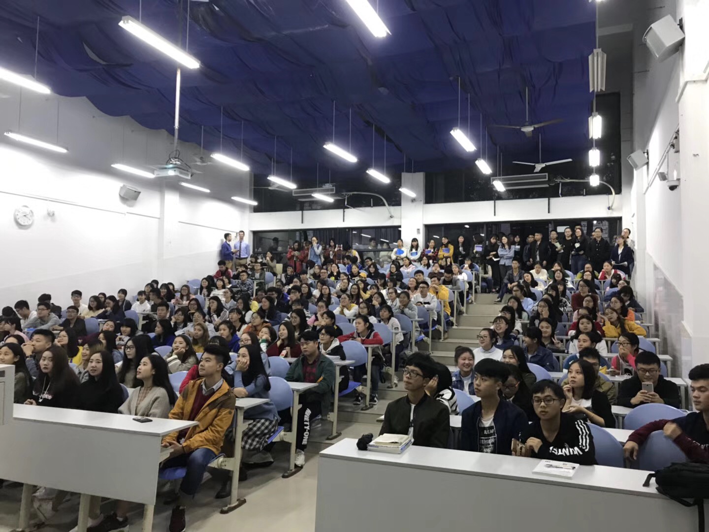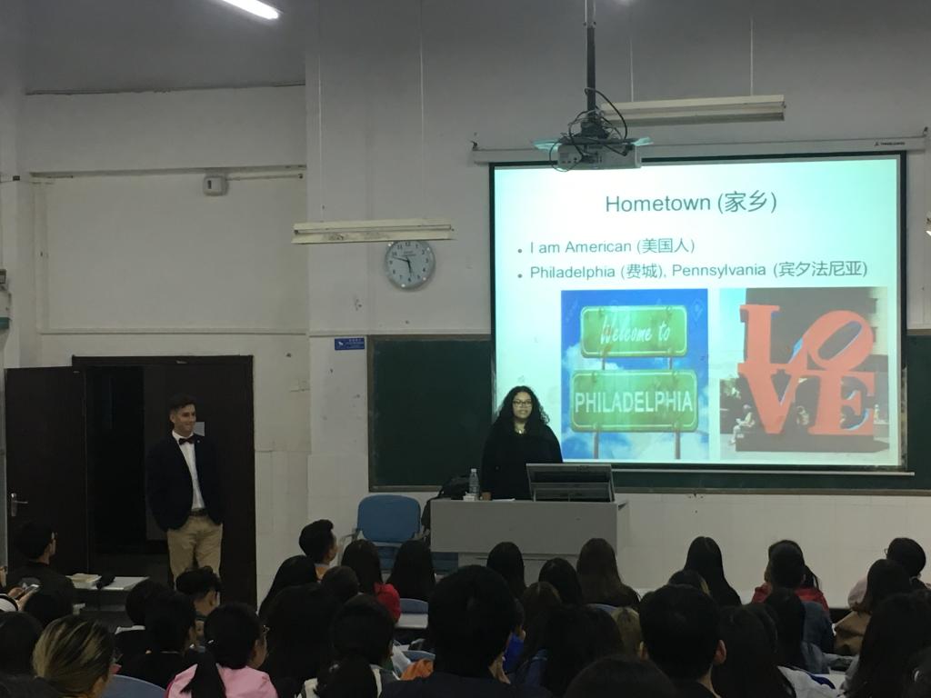 180人的大教室座无虚席,人头攒动,连教室两旁和最后一排都站满了晚来的学生。两名外教首先对自己的教育背景、兴趣爱好、家庭成员等做了自我介绍,同时简短讲解了美国和平队的中国项目——“美中友好志愿者”项目的基本情况。接着同学们和外教互动讨论,为后期的“英语角”活动主题提出建议。现场同学们积极参与,踊跃发言,现场气氛十分活跃。