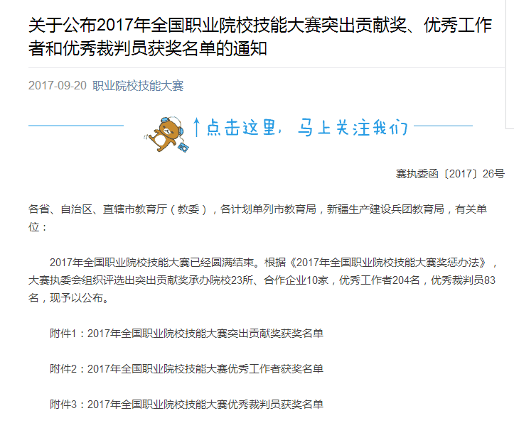 据悉,经大赛执委会组织评选,共评选出突出贡献奖承办院校23所、合作企业10家,优秀工作者204名,优秀裁判员83名。