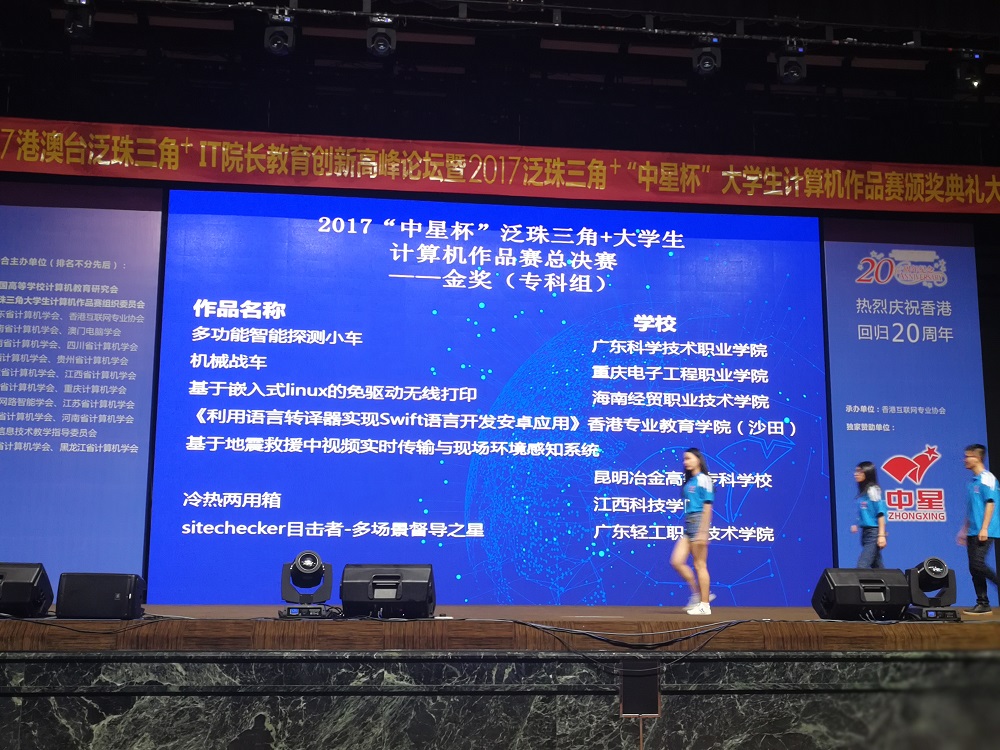 2017年7月5日,2017泛珠三角+“中星杯”大学生计算机作品赛颁奖典礼在香港会展中心举行。重庆电子工程职业学院计算机学院共2项作品入围奖项,其中,由刘明和赵鹏举教师指导的“机械战车”作品获得总决赛高职组金奖(一等奖的第二名)和最佳创新奖(高职组唯一入选作品),由鲁先志老师指导的李子熊、刘俊江两名学生作品“网络安全虚拟实训平台”获得铜奖和最佳展示奖,这是我校首次参加该赛事获此殊荣。