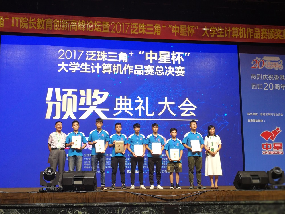 泛珠三角+“中星杯”大学生计算机作品赛是由广东省计算机学会发起,港、澳、台及大陆海峡两岸暨香港、澳门协同参加的重大赛事,是纪念香港回归二十周年系列活动之一。参加本次大赛颁奖典礼的全国嘉宾1千多人,香港政府信息科技总监太平坤士杨德斌先生,香港互联网专业协会副会长洪文正先生,全国高等学校计算机教育研究会副理事长朱庆生教授等领导参加了颁奖仪式并致辞,场面隆重而恢弘。