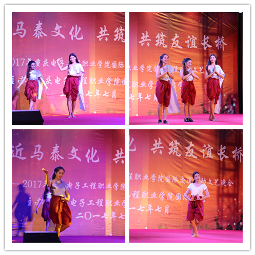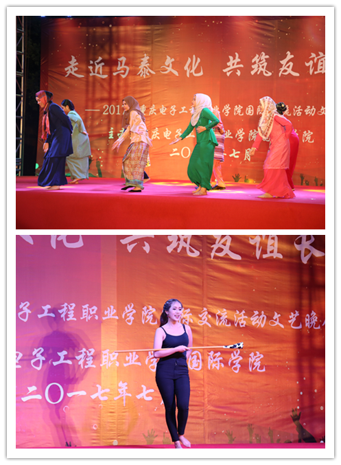 2017年7月5日晚,由重庆电子工程职业学院国际学院和党委学工部共同举办的我校首届中外学生国际交流活动文艺晚会在南校区篮球场举行。党委副书记唐玉林、副校长龚小勇,党委组织统战部部长刘洪光、国际学院党总支书记唐莉、国际学院院长莫绍强、马来西亚博特拉大学(UPM)MOHD HAIRUL ANUAR BIN RAZAK(安华)、马来西亚多媒体大学RAZEELAN BIN SAAIDAN KADRI,以及部分二级学院党总支书记、美中志愿者项目的外籍教师、马来西亚留学生代表、泰国留学生代表和各二级学院师生代表出席了此次活动。三名主持人分别以汉语、英语和马来语三种语言进行主持。