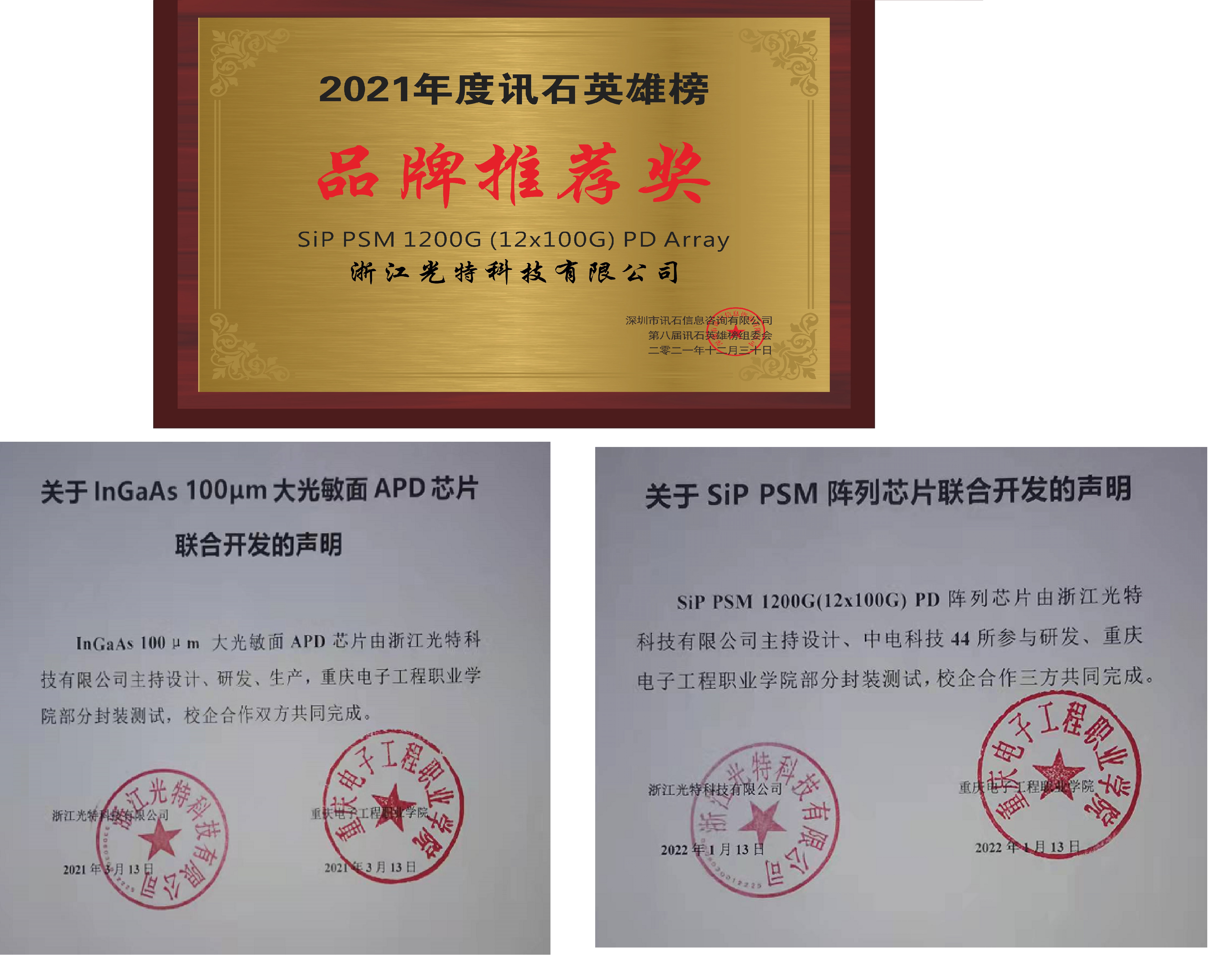 SiP PSM 1200G(12x100G) PD阵列芯片单通道速率最高可达100Gbps,可广泛应用于光时域反射计、激光测距/距离测量、空间光传输、低光级探测、激光报警和激光雷达等领域。该获奖芯片是重电及光特公司长期深入合作取得的又一里程碑式的成果。