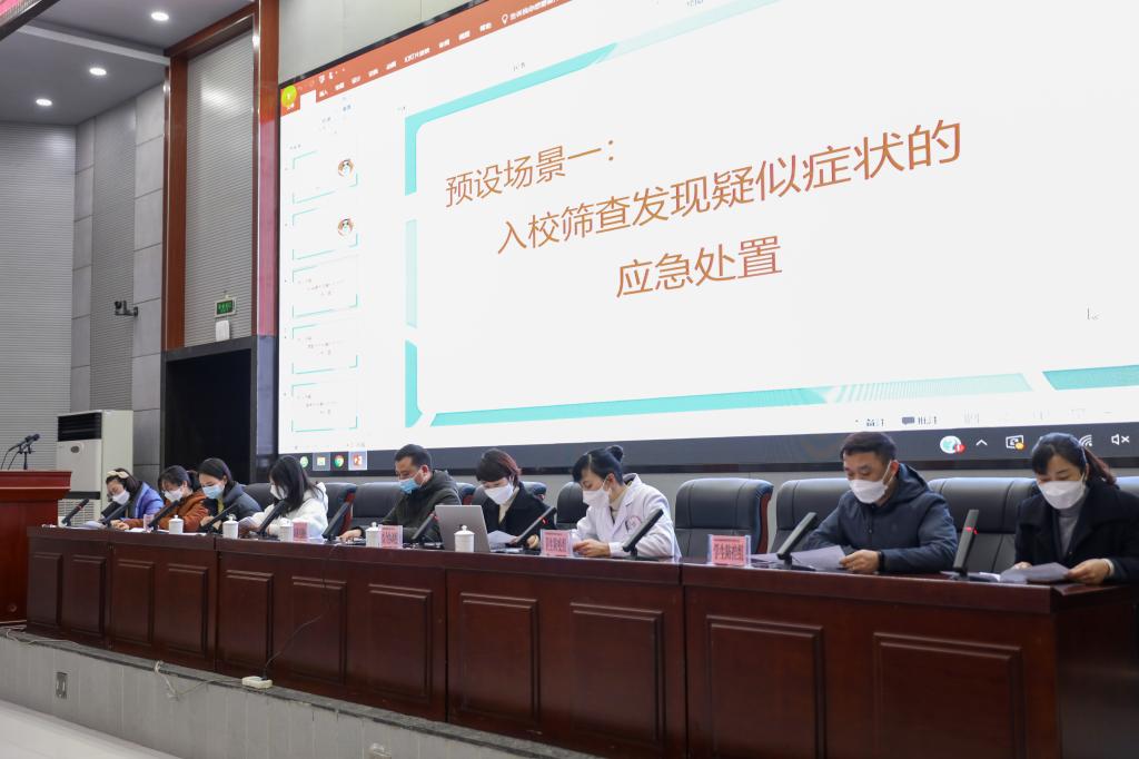 演练开始前,主持人就此次演练的背景、目的、意义及主要模拟演练场景进行了介绍,并对照新修改的疫情防控应急处置流程图进行了现场梳理。此次演练共设计了五个场景,分别是学生入校筛查发现疑似症状、教室发现疑似症状、宿舍发现疑似症状、出现黄(红)码和或途径中高风险地区、发现水痘的应急处置流程。