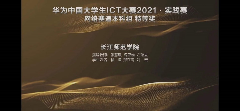 2020年起,我校和长江师范学院联合培养相关专业本科学生。此次由重电张慧敏、陶亚雄、左琳立三位老师指导的长师通信工程本科班学生刘宏、徐峰、邢在涛代表队力克群雄,获得“华为中国大学生ICT大赛2021”实践赛全国总决赛本科组网络赛道特等奖。一方面体现了联合办学的优势,更为重电的职教本科开云电子平台_开云(中国)之路进行了有效尝试,学生实践应用能力培养成效显著。