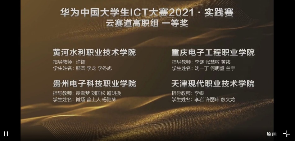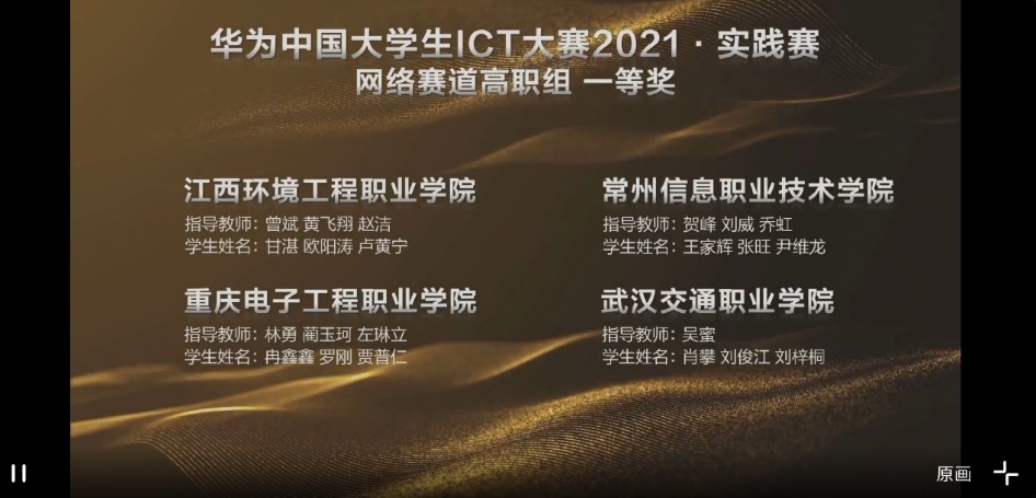 由我校通信工程学院林勇、蔺玉珂、左琳立三位教师指导的通信系统运行管理专业群华为卓越人才试点班学生罗刚、贾普仁、冉鑫鑫代表队获得“华为中国大学生ICT大赛2021”实践赛全国总决赛专科组网络赛道全国一等奖;李饶、张慧敏、黄祎三位老师指导的沈一丁、何明盛、兰宇代表队获“华为中国大学生ICT大赛2021”实践赛全国总决赛专科组云赛道全国一等奖。