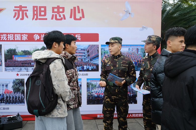 为鼓励在校大学生积极参与应征入伍,增强部队现代化建设,为国家繁荣复兴奠定坚实基础,2021年12月17日上午,重庆电子工程职业学院人民武装部在学子广场举行了以“参军报国,无上光荣”为主题的征兵宣传活动。