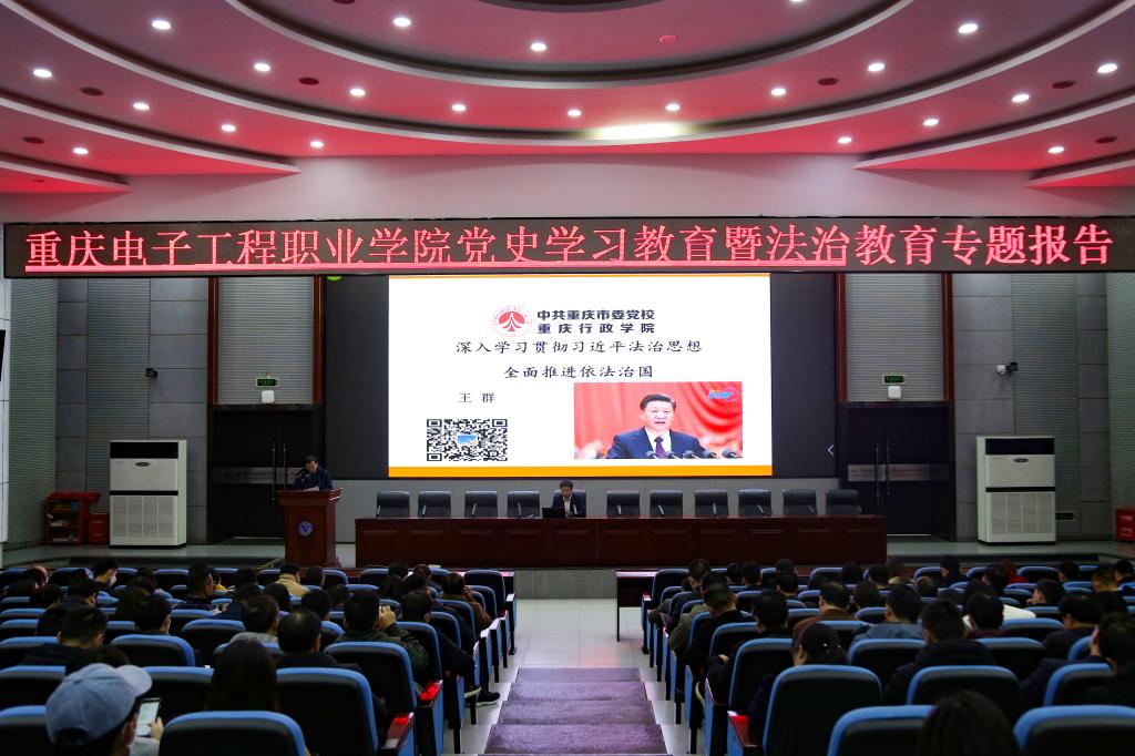 12月10日,学校在博润厅召开党史学习教育暨法治教育专题报告会,重庆市“百名法学家百场报告会”宣讲团成员,中共重庆市委党校副教授,法学博士,硕士生导师,西南政法大学和四川省社会科学院联合培养博士后王群应邀来校作题为“深入学习贯彻习近平法治思想,全面推进依法治国”专题报告。处科级干部(含组织员、监察员),全体辅导员,马克思主义学院教师、学生代表共计300余人参加宣讲会。会议由党委学生工作部部长何光明主持。