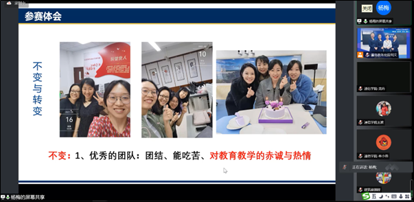 然后,杨梅老师与老师们分享了团队的备赛历程、备赛各环节的关键点,从研读文件要“仔细”、研读作品要“科学”、重构内容要“逻辑”、凝炼特色要“对标”、文本撰写要“精雕细琢”、实施报告要“独家”、视频拍摄要“真实”等方面进行了详细解读。