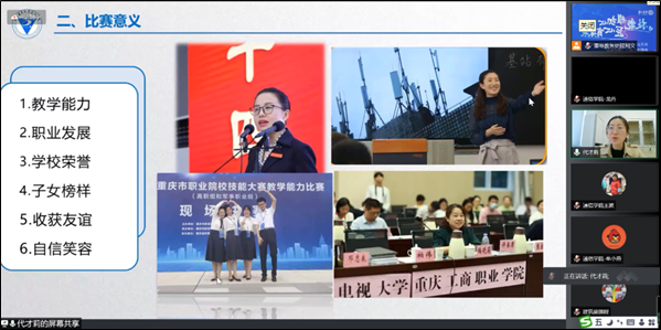 为落实全国职业教育大会精神,根据《国家职业教育改革实施方案》《职业教育提质培优行动计划(2020-2023年)》《关于推动现代职业教育高质量发展的意见》等相关文件精神,推进“三教”改革,促进教师综合素质、专业化水平和创新能力全面提升,同时为了做好校赛筹备、市赛推荐和冲击国赛等工作,教务处在3月24日13:00~17:00通过腾讯会议开展了教师教学能力比赛备赛经验分享活动。