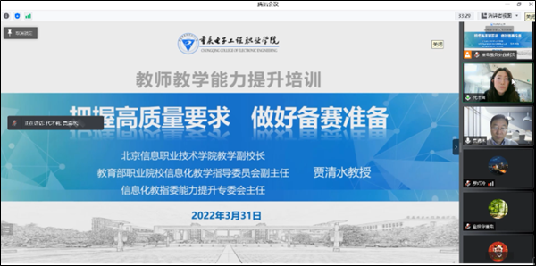 继2022年3月24日开展了教师教学能力比赛备赛经验分享活动后,为进一步推进校级教学能力比赛备赛工作,提高教学比赛质量,教务处于3月31日邀请到北京信息职业学院副校长、教育部职业院校信息化教学指导委员会副主任、信息化教指委能力提升专委会主任贾清水教授为我校教师做“把握高质量要求,做好备赛之准备”专题报告。
