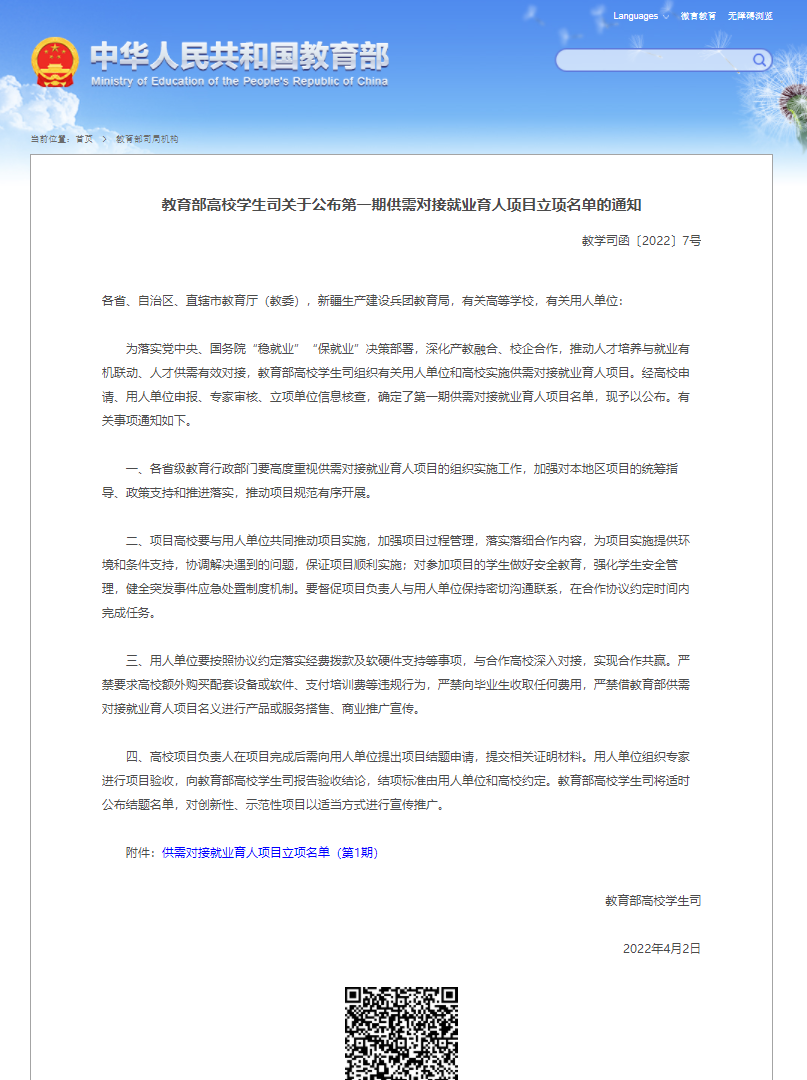 相关链接:http://www.moe.gov.cn/s78/A15/tongzhi/202204/t20220406_614176.html