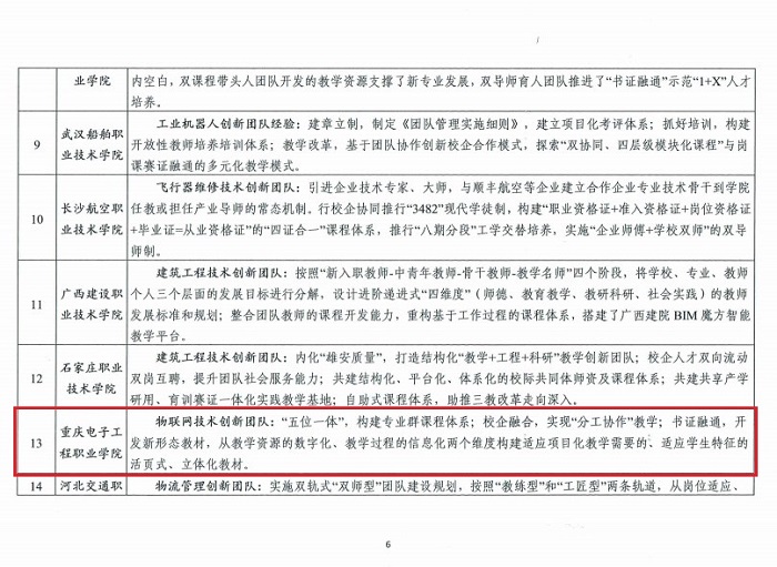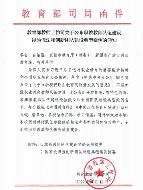 2022年4月,教育部教师工作司发布《教育部教师工作司关于公布职教教师队伍建设经验做法和创新团队建设典型案例的通知》,我校物联网技术创新团队成功入选国家级职教创新团队建设典型案例名单。