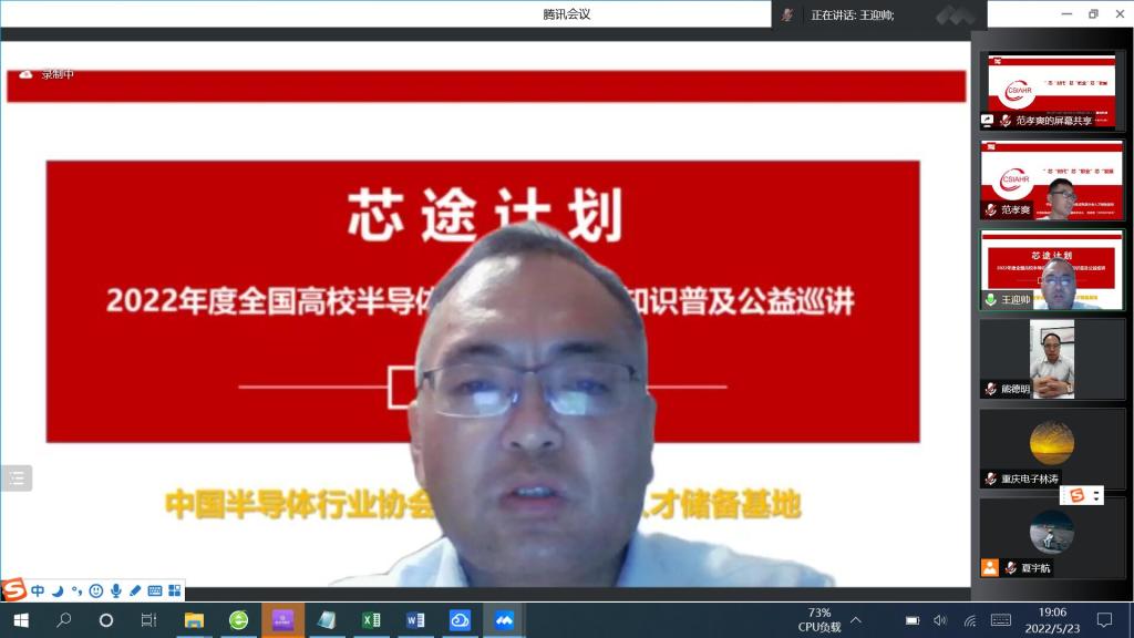 5月23日,由中国半导体行业协会集成电路分会人才储备基地主办的“芯途计划”-“2022年度全国高校半导体集成电路行业知识普及公益巡讲”,走进重庆电子工程职业学院(简称“重电”)。我校电子与物联网学院(简称“电物学院”)集成电路系微电子技术、应用电子技术、智能终端技术与应用(智能产品开发与应用)、电子产品营销等专业的500余名师生线上参会。