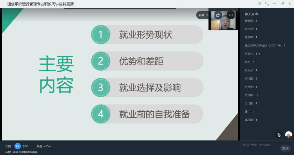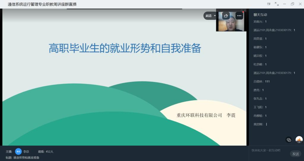 为了更好地了解ICT领域的就业形势,让学生提前做好就业前的准备工作,通信工程学院在2022年5月26日的职业教育活动周,邀请了重庆环联科技有限公司的李震总经理在线上开展了“高职毕业生的就业形势和自我准备”的专题讲座。通信工程学院500多名师生在线共同听取了本次讲座。