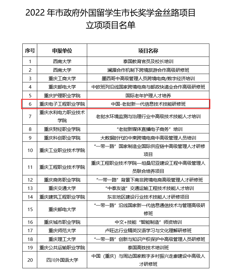 2022年6月2日,重庆市教委公布了“2022年市政府外国留学生市长奖学金丝路项目”立项名单。我校人工智能与大数据学院和国际交流与合作发展处联合申报的《中国-老挝新一代信息技术技能研修班》经过激烈竞争最终获得立项。