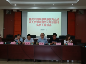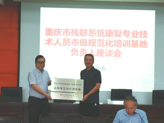 2022年6月10下午,全市残联系统首批康复专业技术人员市级规范化培训基地负责人座谈会在重庆市残疾人综合服务中心举行,我校智慧健康学院院长谢光辉教授作为康复辅具类规范化培训基地负责人被邀请参加,并接受基地授牌。