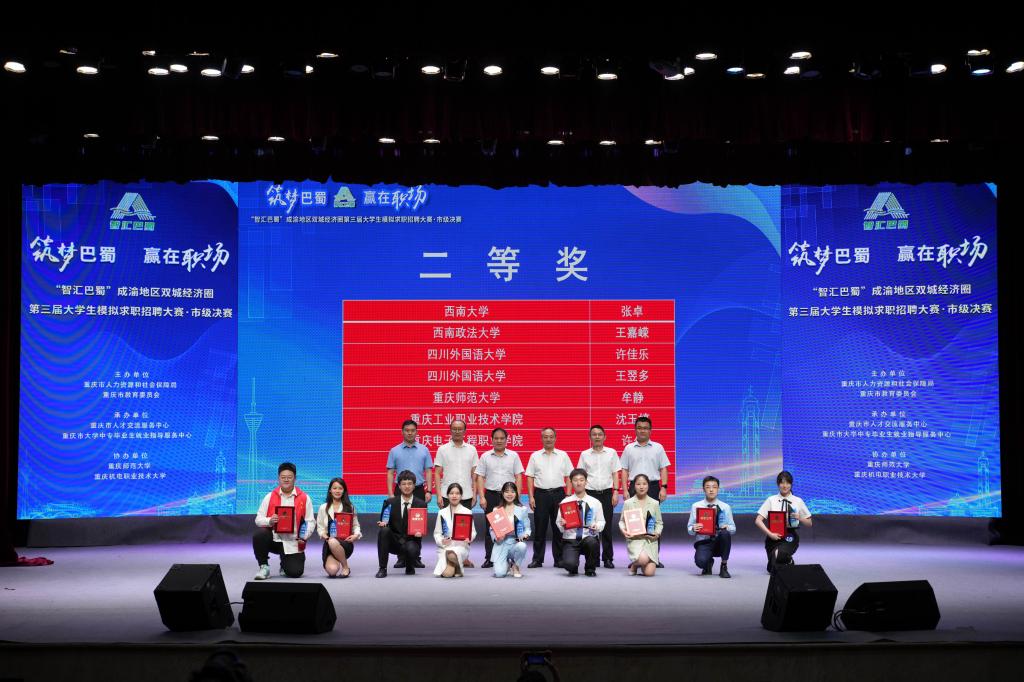 成渝地区双城经济圈第三届模拟求职招聘大赛由重庆市人力资源和社会保障局、重庆市教育委员会、四川省人力资源和社会保障厅、四川省教育厅联合举办,旨在强化对川渝两地普通高校学生的职业指导,帮助其树立正确的就业观念,提升就业能力,促进毕业生顺利就业、充分就业和更高质量就业。成渝地区双城经济圈第三届模拟求职招聘大赛重庆赛区共有二十余万人报名参与。比赛分为四个赛程:校级决赛,N进180,晋级名单由各高校推荐产生;市级复赛,180进60,由选手自我介绍、现场面试、职业生涯规划书三部分组成,共有24名专科选手,36名本科及研究生选手入围半决赛;市级半决赛,60进30,通过职场游戏,检验选手的思维能力、应变能力;市级决赛,由30强选手角逐,通过个人VCR、无领导小组讨论及压力面试三个部分组成。本次全市角逐出特等奖一名、一等奖五名、二等奖九名、三等奖十五名。特等奖及一等奖选手直接入围成渝地区双城经济圈模拟求职招聘大赛总决赛。