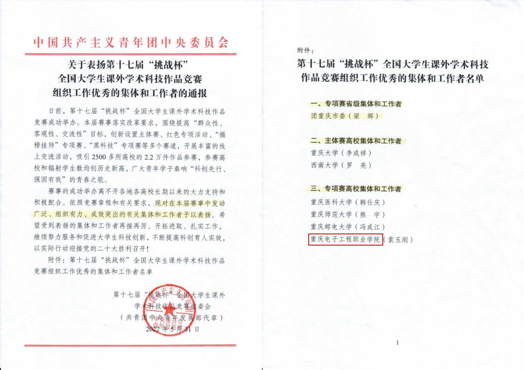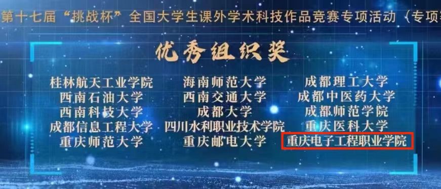 第十七届“挑战杯”全国大学生课外学术作品竞赛在四川大学落下帷幕,重庆电子工程职业学院荣获“挑战杯”竞赛专项赛优秀组织奖,全国共15所本专科院校获此殊荣。习近平总书记强调:“科技创新是人类社会发展的重要引擎,是应对许多全球性挑战的有力武器,也是中国构建新发展格局、实现高质量发展的必由之路。”加大技术技能英才教育,提高学校创新创业水平,是我校在推进高等教育综合改革、提高开云电子平台_开云(中国)质量方面的重要举措之一。