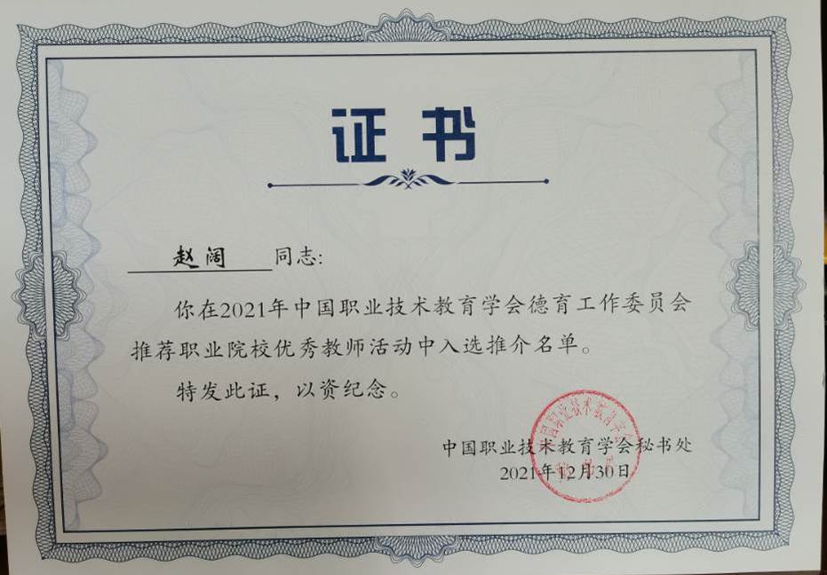 近日,由中国职业技术教育学会组织的“推荐职业院校优秀教师、优秀毕业生和优秀在校生”活动结果揭晓,我校赵阔老师入选2021年中国职业技术教育学会优秀教师。