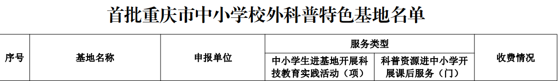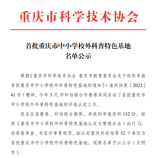 据了解,首批“重庆市中小学校外科普特色基地”是重庆市科协为充分调动社会积极性,发挥社会科普资源作用,面向公众特别是青少年开展科普活动,推进科普工作社会化、群众化、经常化而设置。先后经过区级初评、推荐,市级评选公示等多个环节,最终将由重庆市科协予以认定命名。