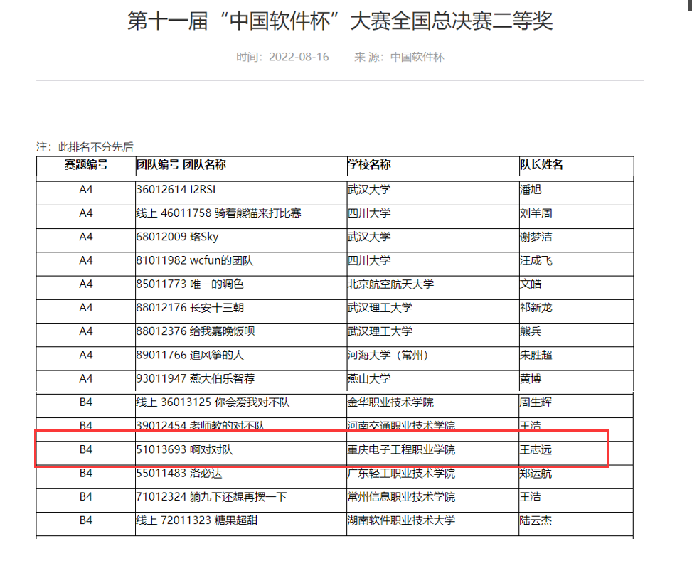 2022年8月17日,第十一届“中国软件杯大学生软件设计大赛”总决赛在南京落下帷幕,经过紧张激烈的多轮比拼,重庆电子工程学院通信工程学院代表队从全国31个省市、1000余所高校、5000余支赛队、近两万名参赛队员中脱颖而出,喜获全国二等奖,是重庆市职业院校在本届大赛上的最佳成绩,并实现重庆电子工程学院在该赛项上的全国二等奖突破。