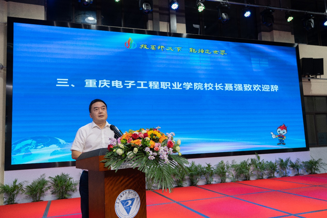 重庆电子工程职业学院聂强教授致欢迎辞。他表示,大赛由重庆电子工程职业学院承办,是大赛组委会对我校的认可和信任,更是对我校技能人才队伍建设工作的鞭策和鼓励。我们一定会尽心尽力做好相关工作,为这次大赛提供优质服务,全力保障比赛的顺利进行,特别要做好新冠疫情的防范工作。同时,我们也将把握这次难得的学习机会,虚心向参赛兄弟院校和单位学习高超技能和宝贵经验,以更好地推进我校高技能人才队伍的建设。