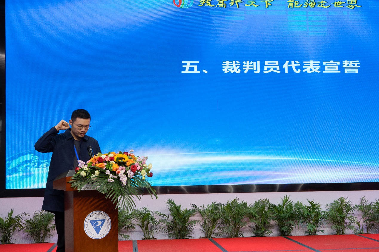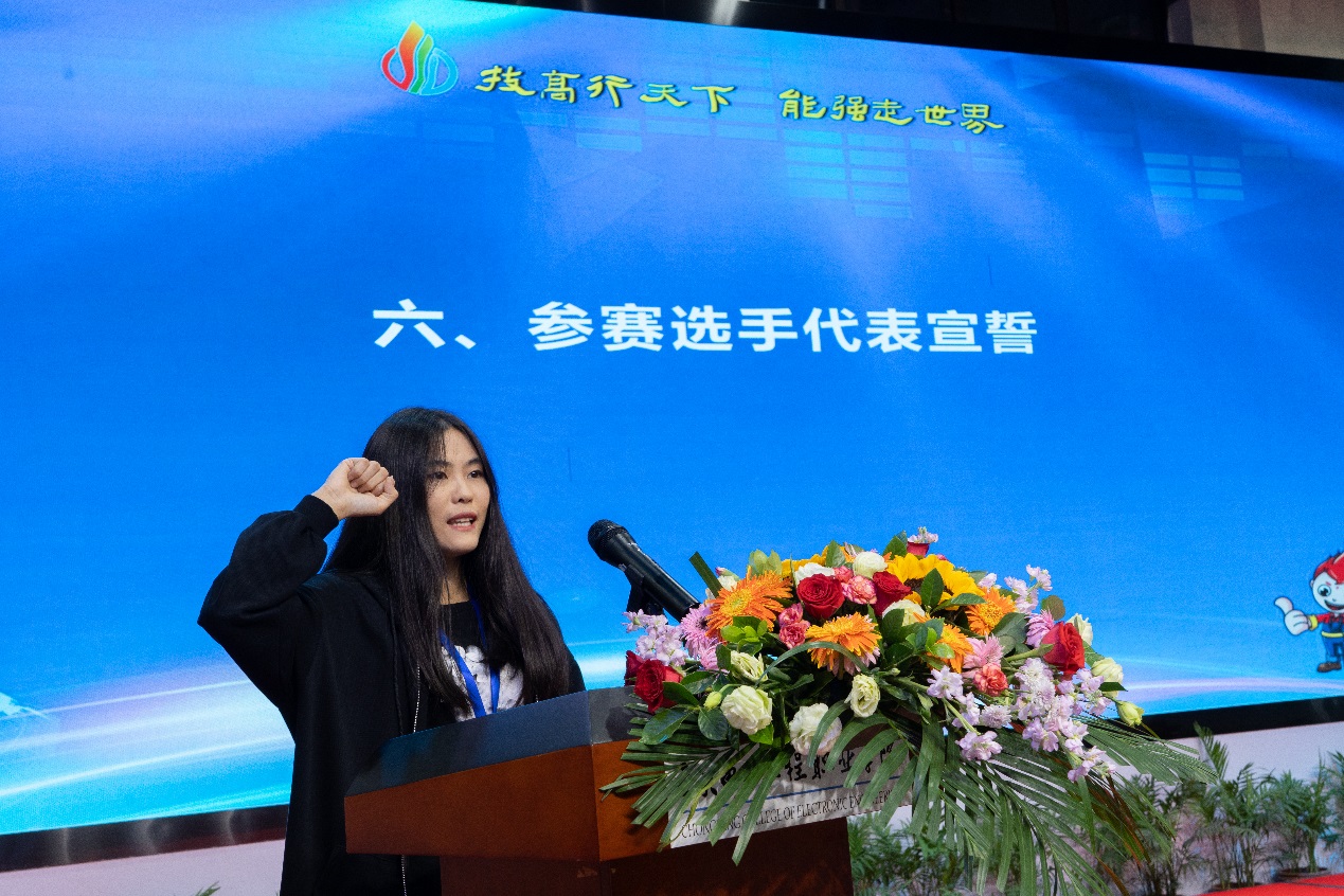 参赛选手代表进行了宣誓。表示尊重裁判,尊重大赛主委会规定,努力拼搏,赛出成绩,赛出水平,赛出风格。练就过硬本领、投身强国伟业,在技能成才、技能报国之路上谱写最灿烂的青春华章。
