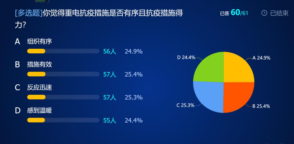 姜老师在思政课上,引导学生在面对突如其来的校园疫情时,要坚定信心、保持镇定,不能懈怠,更不能恐慌,要积极配合疫情防控工作,做好自身健康的第一责任人。重电师生的并肩同行、众志成城,定能尽快战胜疫情,坚信在不久的将来,重电校园将恢复欢声笑语和勃勃生机,迎来疫消云散的最美秋天。
