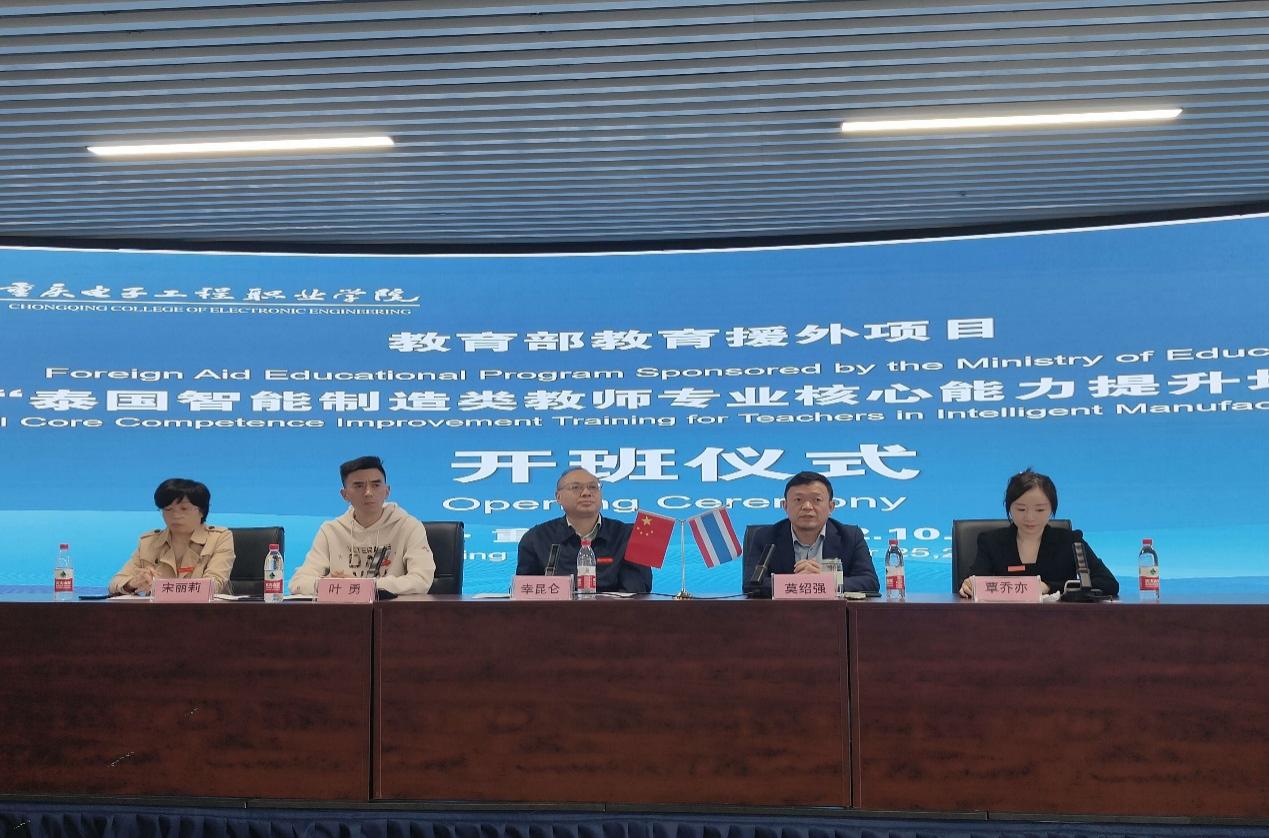 重庆市教育委员会国际合作与交流处处长李斌在讲话中指出,此次重庆电子工程职业学院泰国教育援外项目的立项和开班,一方面是教育部对重电教育教学质量的高度认可,另一方面也印证了重电在国际化方面的办学实力。同时也契合了我市深化建设陆海新通道职业教育合作的需求,也为重庆电子工程职业学院职业教育国际化的发展提供了良好的契机。并希望通过这个项目能够分享重庆在智能制造领域的经验,帮助泰国专业教师提升核心能力,并且相互交流,相互借鉴,共同进步。希望各位学员认真学习实用的职业技能,用心感悟悠久的中国文化,使本项目真正成为一座连接中泰两国民心相通的桥梁。