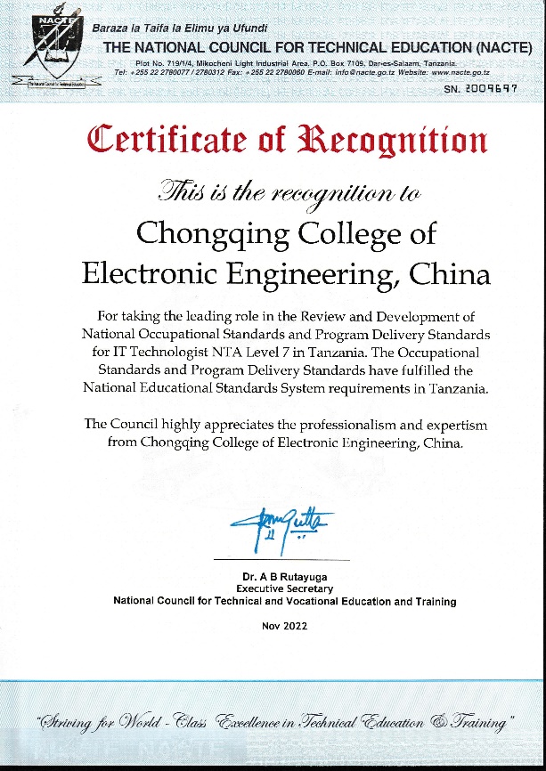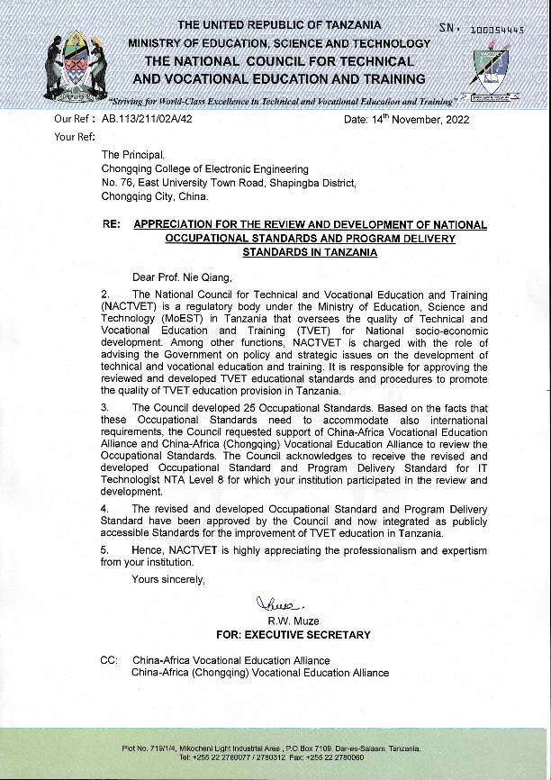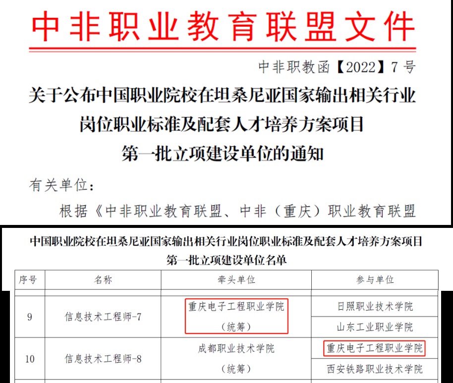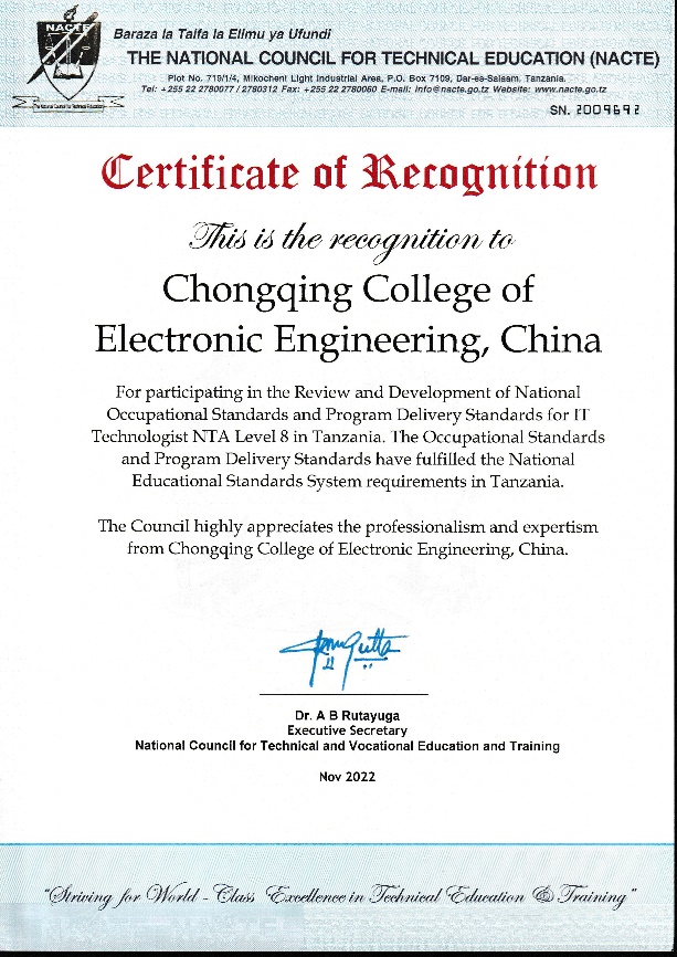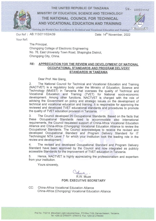 近日,由我校国际合作发展处支持、通信工程学院牵头研制的信息技术工程师7级、8级职业岗位标准以及配套专业教学标准(以下简称标准)通过了坦桑尼亚国家职业教育委员会审核,获得官方认证,并被纳入了坦桑尼亚国家职业教育体系,弥补了坦桑尼亚在信息技术工程师方向的标准缺失,对非洲国家的开云电子平台_开云(中国)和产业发展具备重要意义,是我校国际化标准真正“走出去”的重大突破。