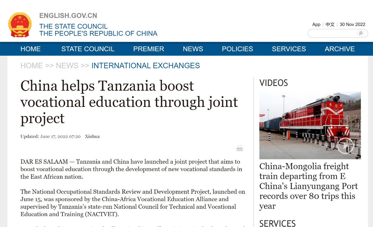 标准研制项目得到重庆市教委、山东省教育厅、陕西省教育厅、四川省教育厅、山东省外事办等多地教育或外事管理部门的支持,联合召开了第一批《坦桑尼亚国家职业标准开发项目》启动会,有来自全国的43所中国职业院校参加,涉及54个不同级别的职业标准。