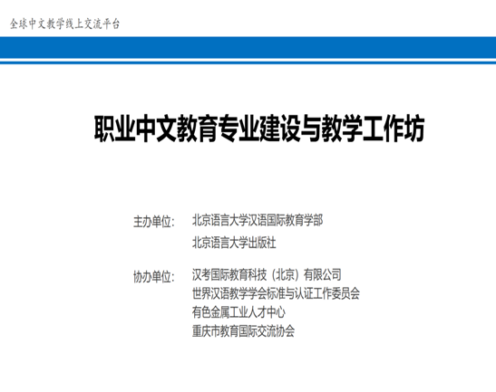 12月17日,由北京语言大学汉语国际教育学部和北京语言大学出版社主办,汉考国际教育科技(北京)有限公司、世界汉语教学学会标准与认证工作委员会、有色金属工业人才中心和重庆市教育国际交流协会共同协办的“中文+职业技能”系列公益讲座继续进行。