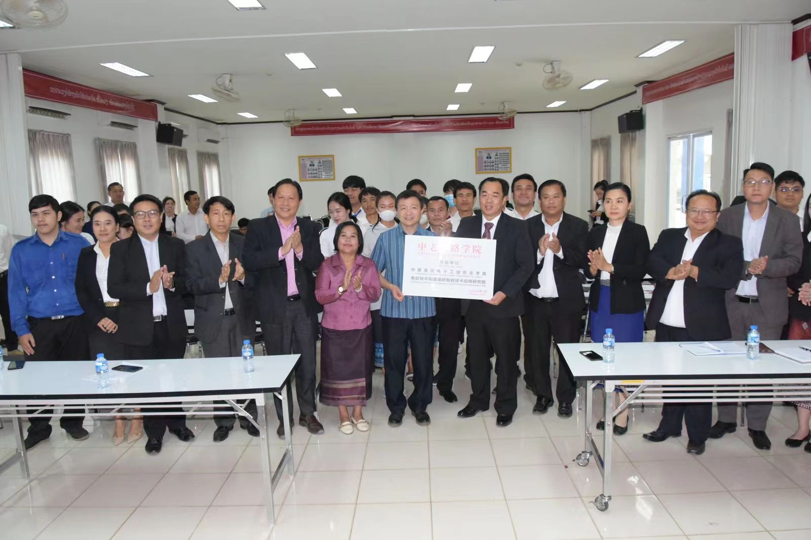在仪式的最后,双方领导共同为“中老丝路学院”揭牌,并签订了两校战略合作协议,仪式圆满结束。揭牌仪式的顺利举办,代表着重电驻老挝“中老丝路学院”正式开始实体化运营。未来,人工智能与大数据学院将以“中老丝路学院”实体化运作为契机,进一步强化产教融合机制下的国际交流与合作,并将科学研究、社会服务等元素融入到对留学生的教育教学中,更好的发挥职业教育对一带一路沿线国家,以及走出去中资企业的支撑作用。
