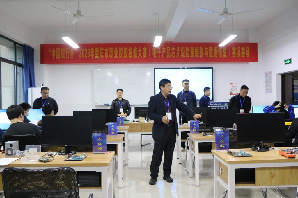 2023年3月24-25日,“中国银行杯”2023年重庆市职业院校技能大赛高职组“电子产品芯片级检测维修与数据恢复”赛项在我校顺利举行,来自重庆市6所高职院校12支队伍的24名选手同台竞技。本次大赛以电子信息产业发展的人才需求为依托,以电子产品芯片级检测维修及存储介质数据恢复技术为载体,将这两方面的前沿技术及技能融入比赛内容,充分展现了选手在真实的工作场景下对电子产品芯片级检测维修及数据恢复的技能运用及综合职业素养表现,全面展现职业教育改进与改革的最新成果及参赛选手良好的精神风貌。