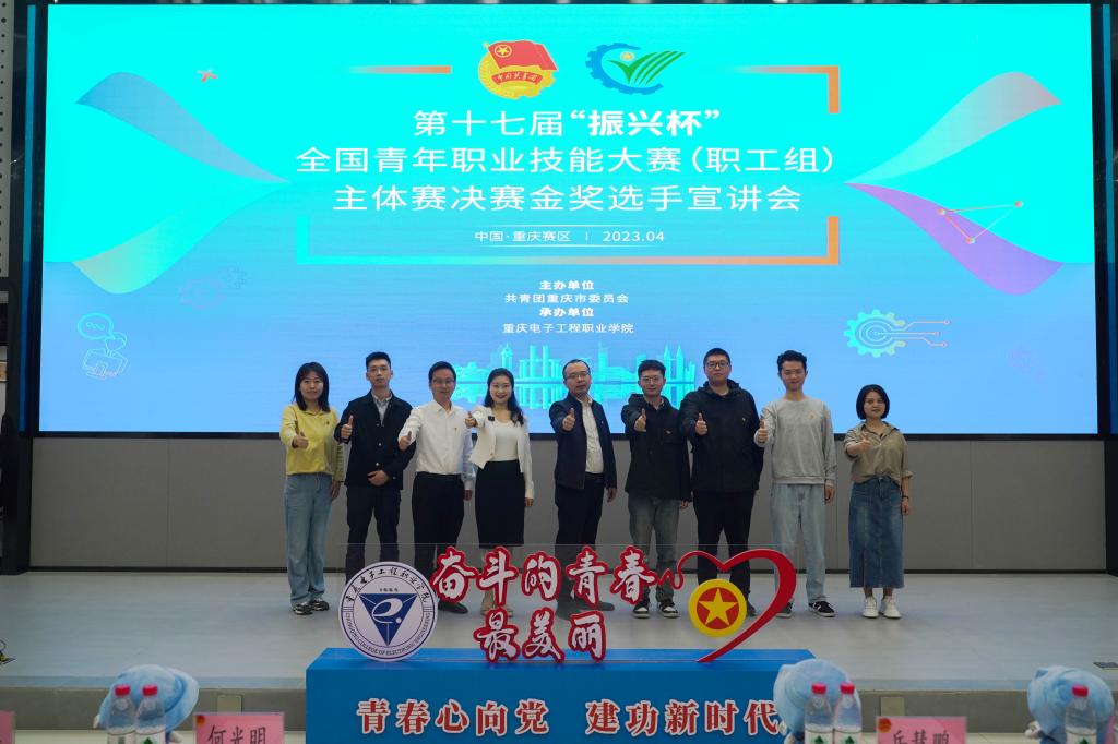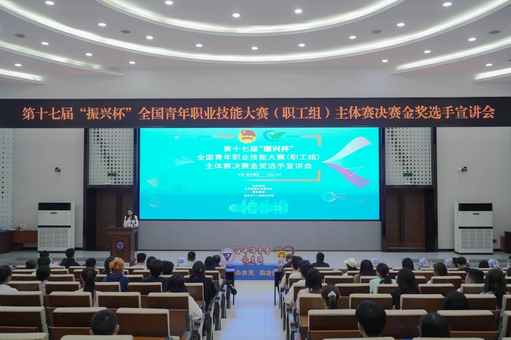 为深入学习宣传贯彻党的二十大精神,贯彻落实习近平总书记关于青年工作的重要思想,努力引导广大青年走技能成才、技能报国之路,4月13日上午9:30,由共青团重庆市委主办、重庆电子工程职业学院承办的第十七届“振兴杯”全国青年职业技能大赛(职工组)主体赛决赛金奖选手宣讲会在学校博远厅顺利举行。团市委青年发展部副部长岳慧鹏、党委学生工作部部长何光明、亚龙智能装备集团重庆公司总经理柯强挺、各二级学院团总支书记、团委专职团干部以及300余名在校师生参加此次宣讲会。重庆工商职业学院教师贾晓东、重庆电子工程职业学院教师吴胜磊、重庆电子工程职业学院教师杨睿、重庆青年职业技术学院教师陈易受邀宣讲,会议由校团委副书记范可佳主持。
