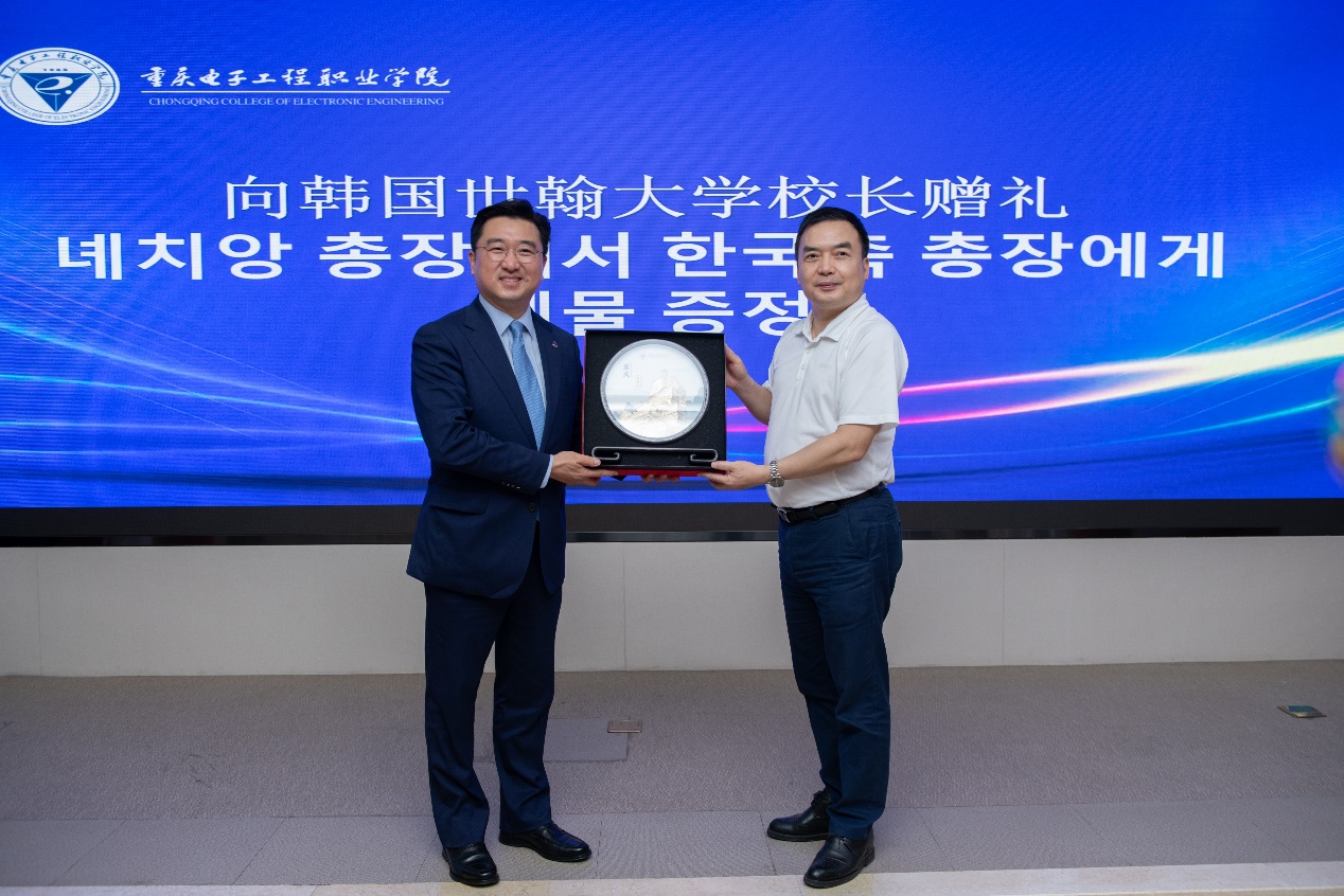 会谈结束后,校长聂强代表我校与韩国京东大学、世翰大学互赠礼物,并合影留念。