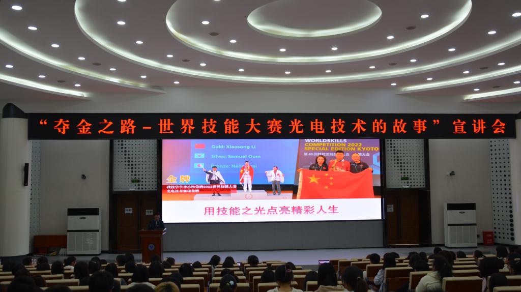 2023年5月9日下午,为深入学习贯彻党的二十大精神和习近平总书记关于技能人才工作重要指示精神,全面落实党中央、国务院和加强新时代高技能人才队伍建设决策部署,按照人力资源社会保障部《关于组织开展“迎国赛、强技能、展风采”主题活动的通知》要求,以成渝地区双城经济圈职业教育活动周为契机,世界技能大赛光电技术项目重庆市集训基地组织开展了以“夺金之路-世界技能大赛光电技术的故事”为主题的宣讲会。来自学校11个学院的300多名学生参加了本次活动。