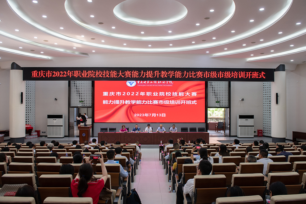 7月13日下午,重庆市2022年职业院校技能大赛能力提升教学能力比赛市级培训班在我校博远厅顺利开班,国家督学、重庆市职业教育学会会长张荣、重庆市职业教育学会宣传培训部主任袁丽娟,我校副校长幸昆仑,教育部国培(重电)基地办主任、重电职教师资培训学院书记兼院长莫绍强主持开班式,来自全市中高职院校的100名荣获市级教学能力大赛团队成员及个人参加开班式。
