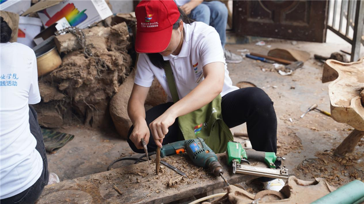 7月4日,重电“红鹰”乡村振兴促进团在村委会工作人员的带领下,走进了根雕传承人马江龙师傅的根雕工作室,探访“化腐朽为神奇”的根雕艺术。志愿者们在马师傅的指导下尝试雕刻一些简单的发簪、手镯等,从“非遗”中感受到中华民族源远流长、博大精深的璀璨文明,从而留住我们自己的“根”。
