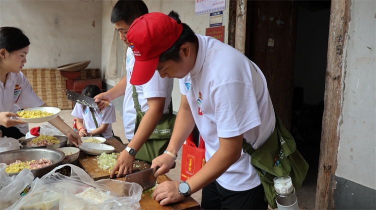 7月5日,重电“红鹰”乡村振兴促进团开展“‘味’爱而来,“香”伴银龄”欢乐之宴活动。志愿者们齐心协力,分工协作,为村内老人们烹饪了一顿丰盛美味的饭菜,并向当地村民学习制作石柱土家族传统美食—斑鸠豆腐,传承传统美食文化。