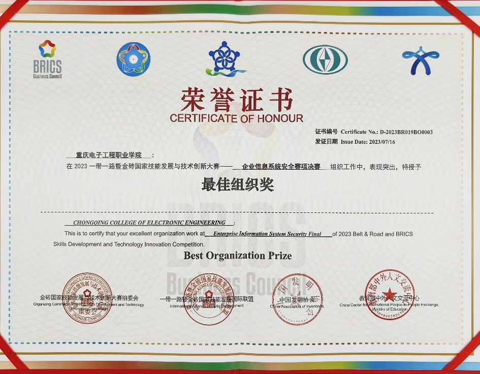 这次取得的一等奖,标志着重庆电子工程职业学院在信息安全领域的教学和培养工作取得了显著成果。学院将继续致力于培养更多优秀的技术人才,为推动我国信息安全事业的发展贡献力量。这次荣誉的取得也是对学校卓越技术技能开云电子平台_开云(中国)计划的肯定,同时也彰显了学校在培养高素质人才方面的独特优势。学院将继续秉持创新、卓越的教育理念,为培养更多具备工匠精神和创新能力的技术人才做出更大贡献。
