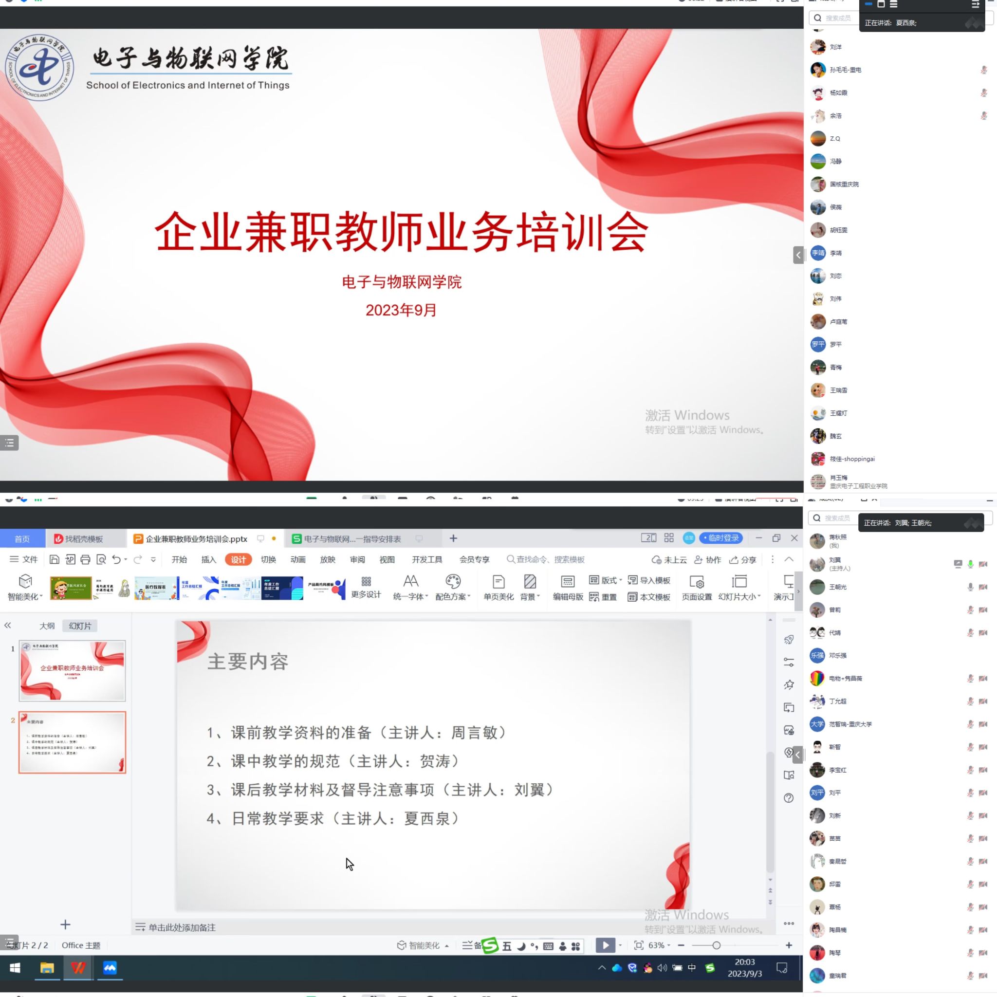 为进一步规范企业兼职教师教学行为,加强企业兼职教师教学管理工作,提高外聘教师教学质量,电子与物联网学院于9月3日晚8:00,通过线上形式组织召开“2023年秋季企业兼职教师业务培训会”。电子与物联网学院副院长夏西泉、教学与课程思政管理科全体人员、各系部主任、校内一对一指导教师及全体企业兼职教师参会。