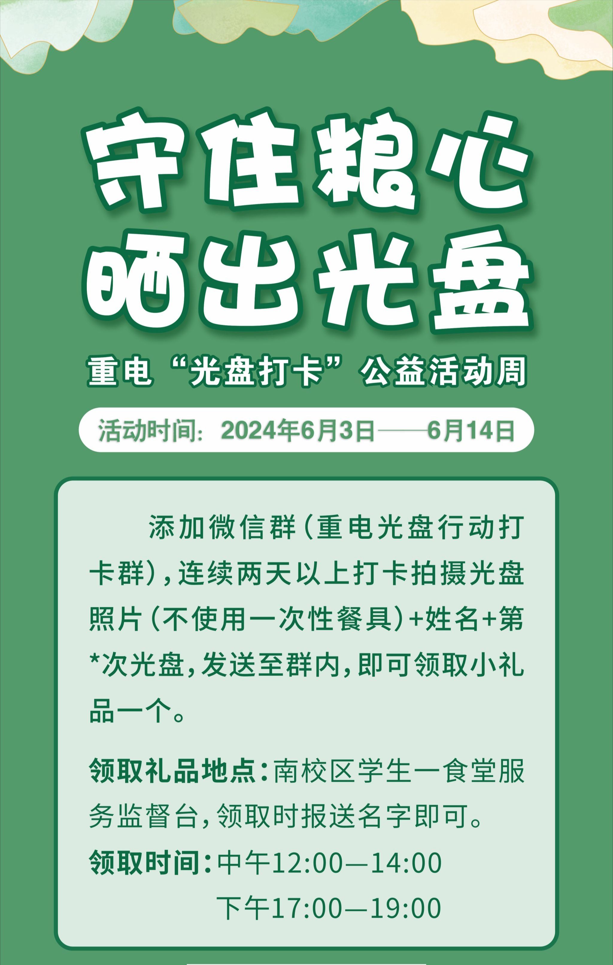 本次“守住粮心,晒出光盘”绿色就餐公益活动,使全校师生们从点滴做起,从餐饮习惯开始,将口号变为行动,保护环境、节约资源、留住绿色,拒绝一次性餐具,实行“光盘行动”,争做节俭生活的践行者、推广者、监督者,共同建设文明、和谐、低碳、绿色、环保的无废美丽校园!
