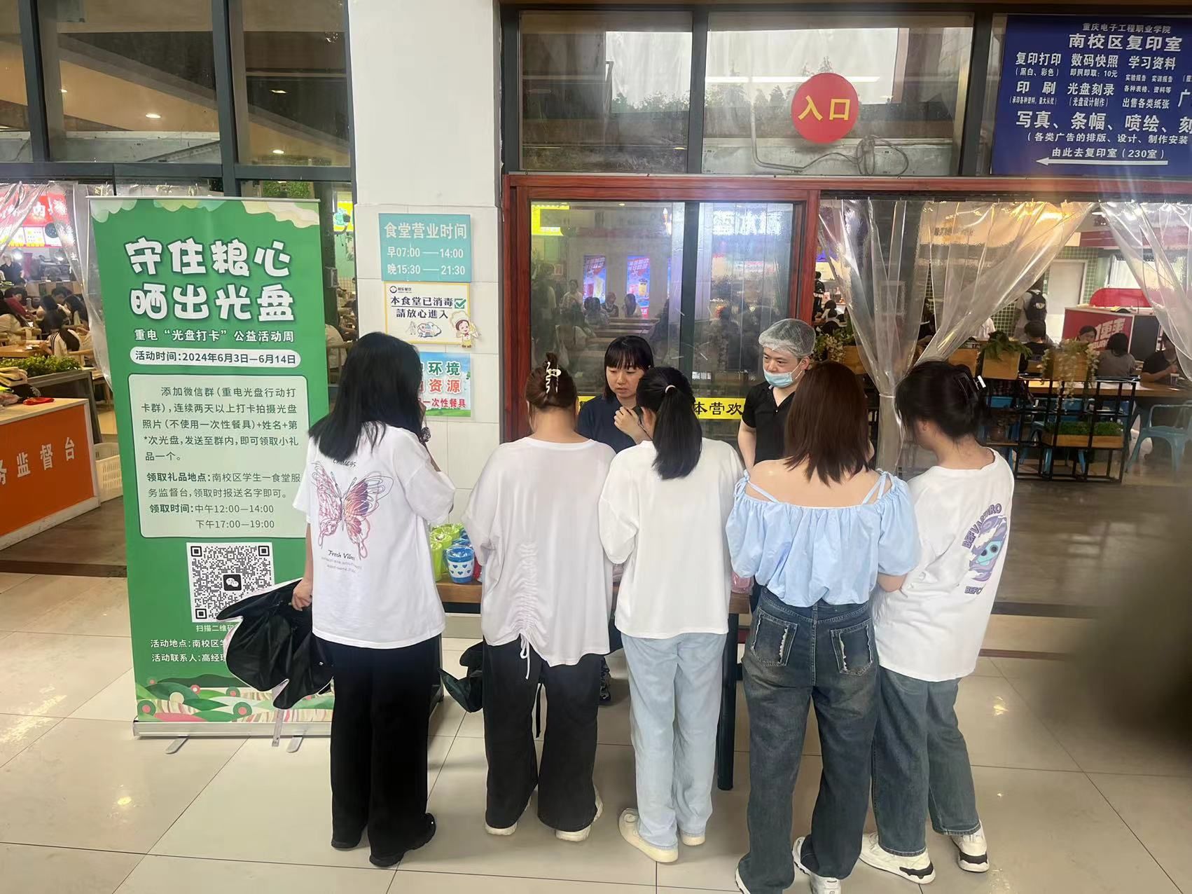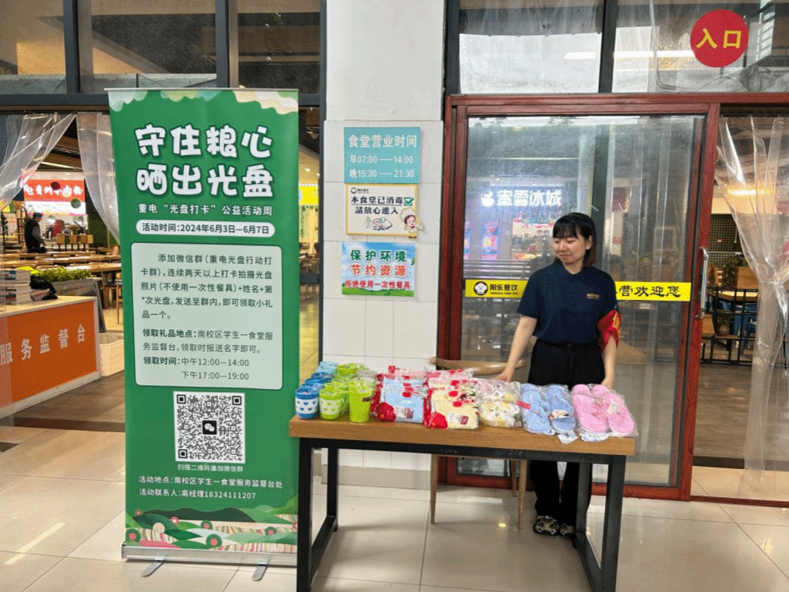 为增加全校师生参加活动的热情,南校区一食堂特别为参加活动的师生们准备了小礼品,鼓励他们养成文明就餐,不使用一次性餐具,珍惜盘中餐的好习惯,积极晒出“光盘”。