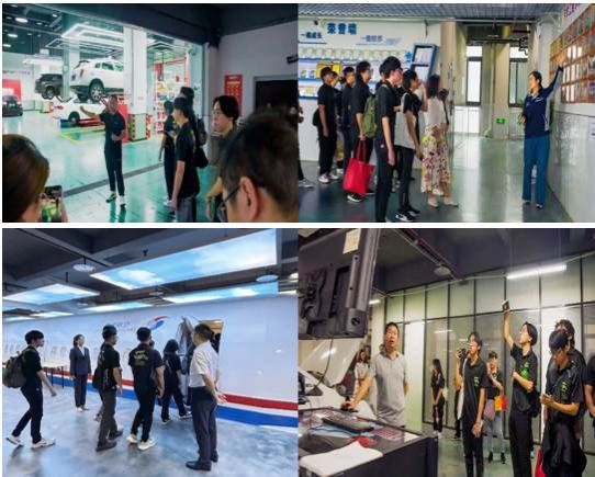 交流团参观了途虎养车实训基地。详细了解了途虎养车的运营模式、业务范畴以及校企之间的合作模式。通过实地观摩,来访师生对汽车售后市场服务有了更为直观的认识。随后,师生们参观了长安汽车校企实训基地。实训基地负责人李蕊老师详细介绍了该基地的教学设施、培训项目以及理实一体化教学模式。同学们对发动机装调、智能化项目、车身电器系检修等多个实训项目表示出浓厚的兴趣并开展了广泛的交流。师生们在参观新能源汽车实训中心时,实训中心负责人教师徐跃进向大家介绍了直流充电台架、长安Ev460整车台架、比亚迪e5整车台架等先进的实训设备,让师生更好地了解新能源汽车技术。最后,在飞行器维修技术专业主任廖灿星带领下,来访师生参观了航空科普走廊和无人机拆装实训室等多个航空实训场所。在廖老师的讲解下,学生们了解了中国航空业的发展历程和成就,对无人机技术、飞机维修等专业知识产生了浓厚的兴趣。